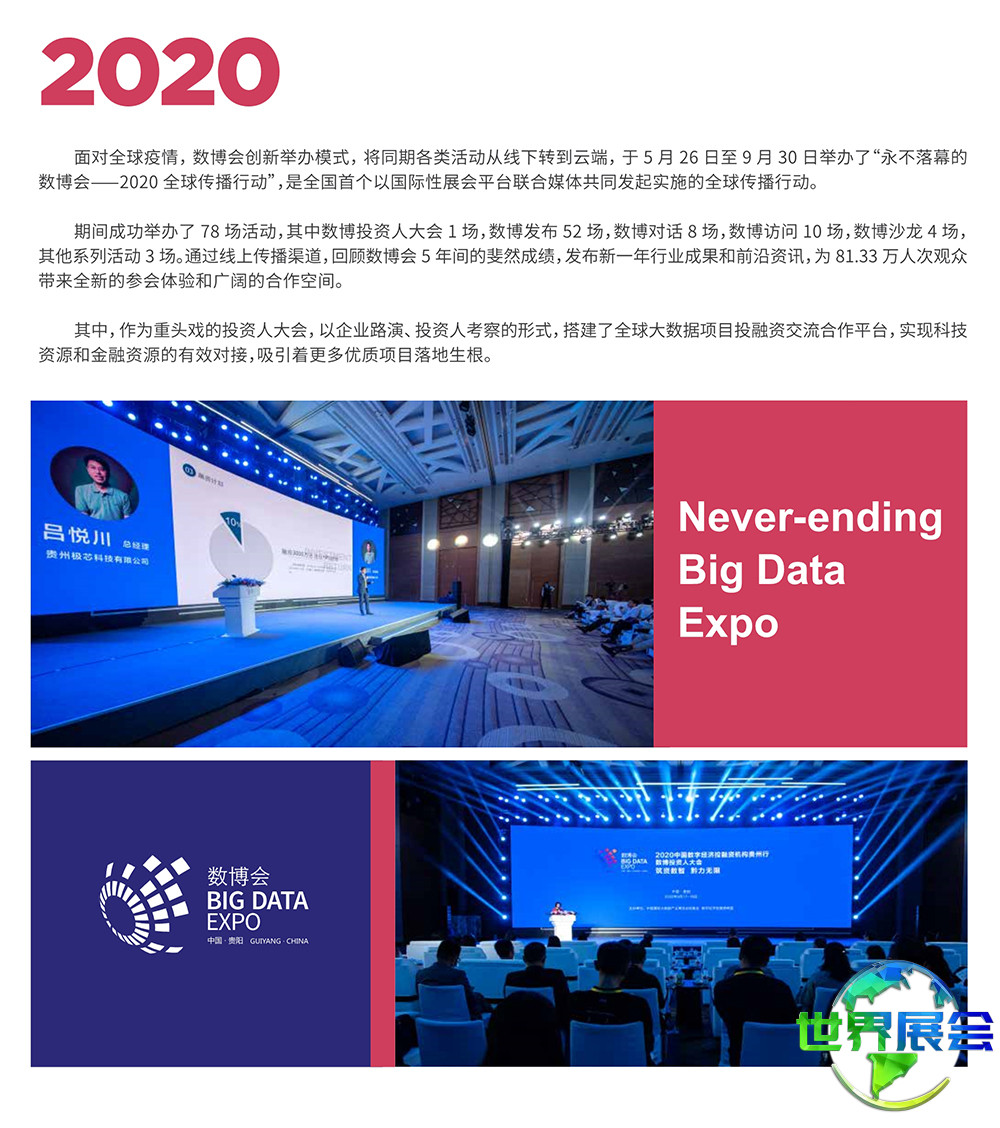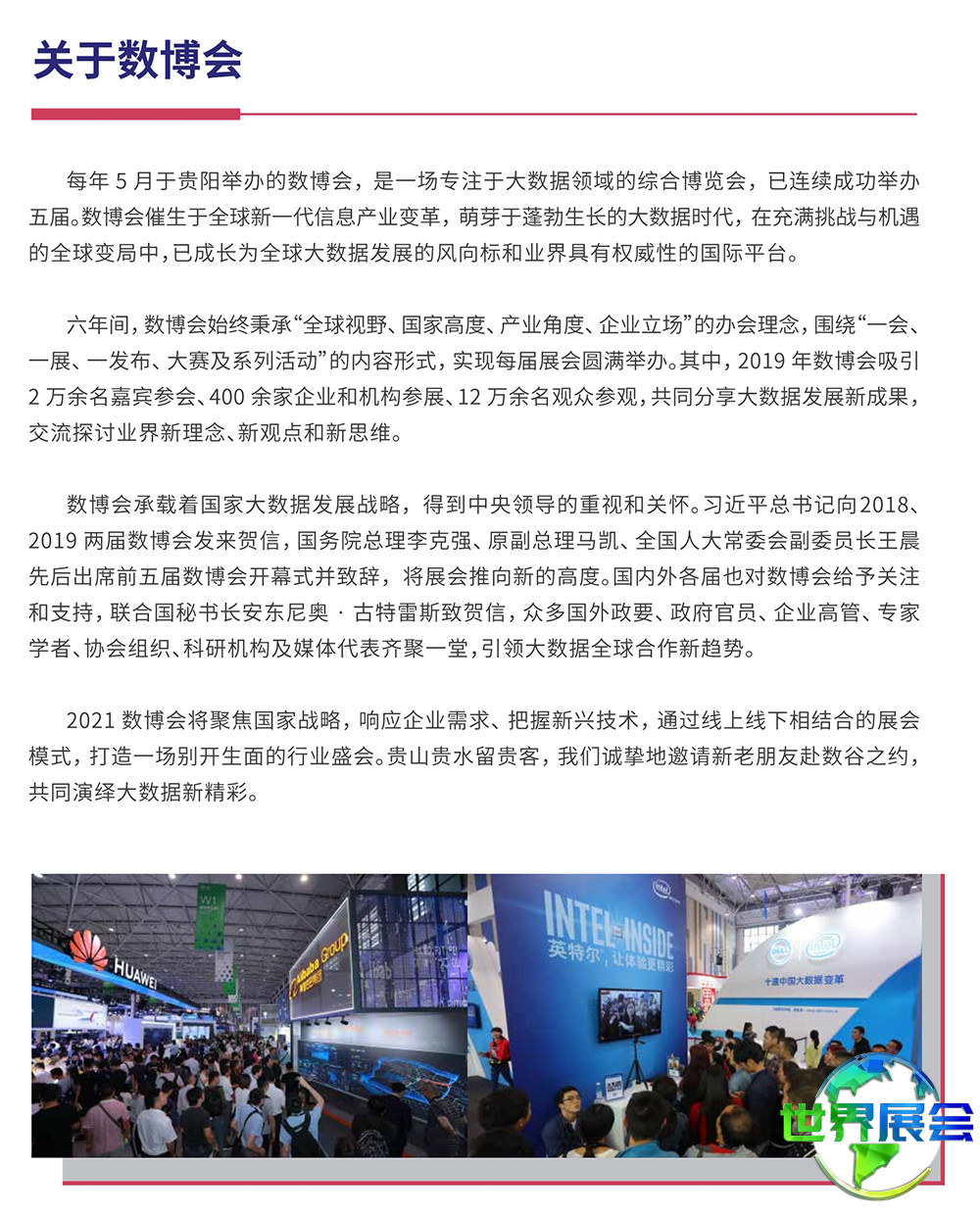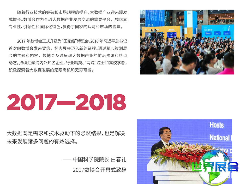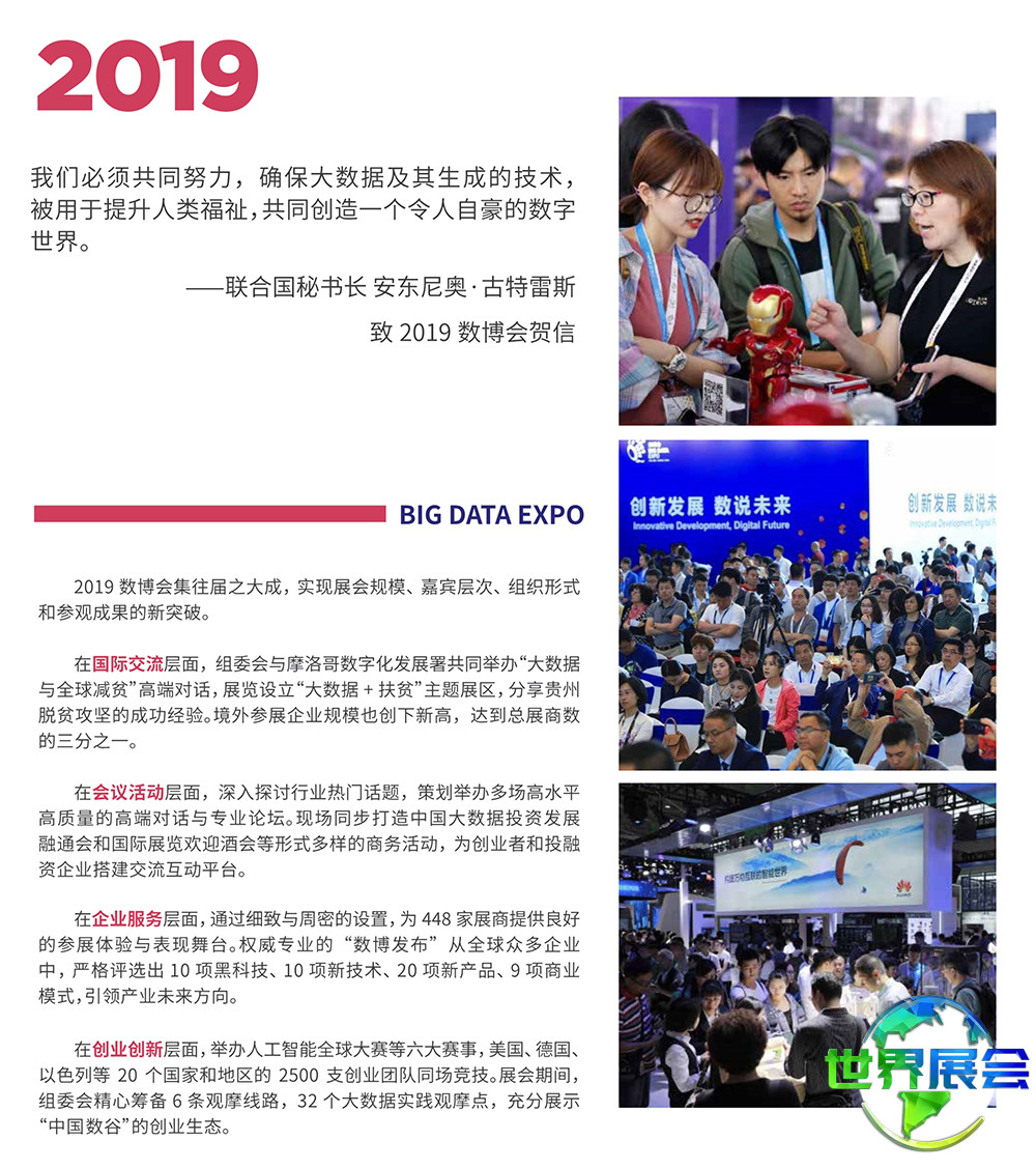 贵阳数博会——中国国际大数据产业博览会(BIG DATA EXPO)将重点关注5G环境下的新兴大数据应用,深度剖析人工智能、工业互联网、区块链等大数据相关新兴产业的发展动向。本届数博会将更加突出创新、融合与开放理念,秉持共赢原则,围绕大数据领域的最新技术突破与成果,组织高端对话、专题论坛、竞赛、展览等多元活动,为高新技术企业打造国际合作、交流互鉴、推广宣传、成果展示的国际化舞台,发掘大数据领域广阔的商业前景与无限潜能。