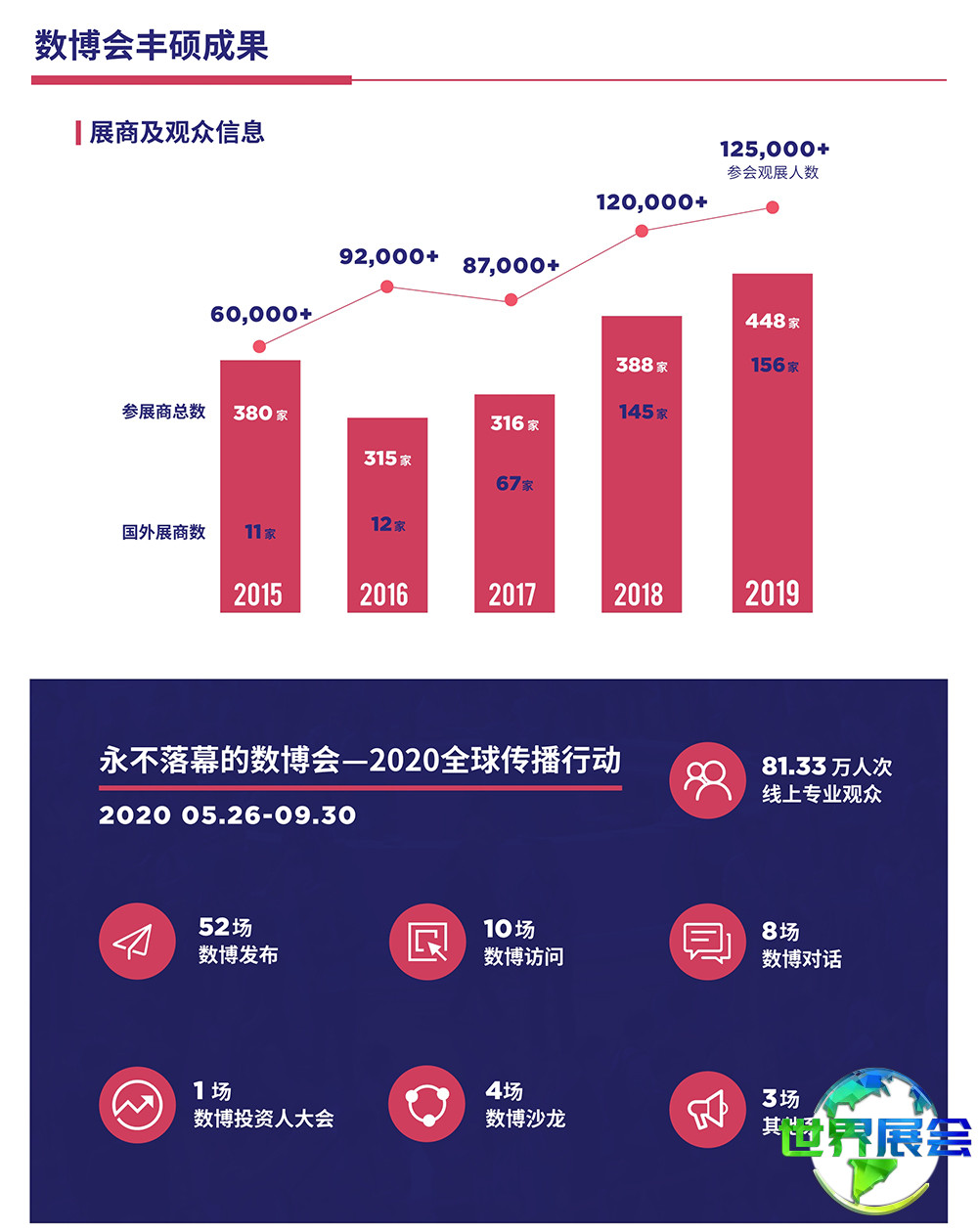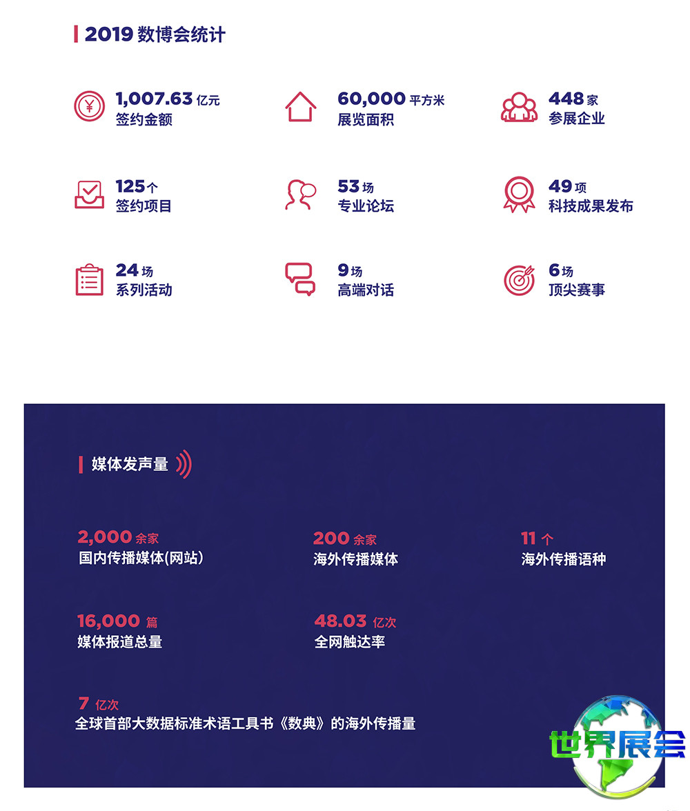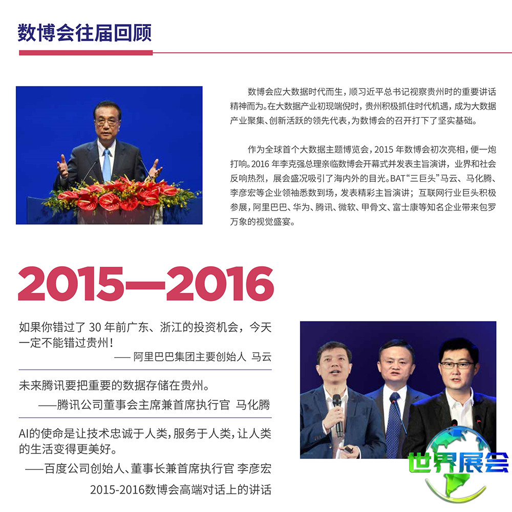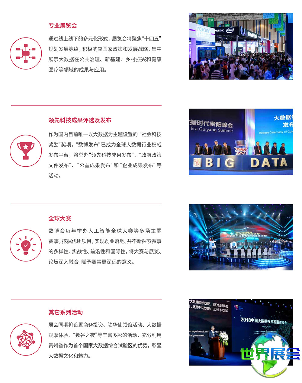 贵阳数博会——中国国际大数据产业博览会(BIG DATA EXPO)将重点关注5G环境下的新兴大数据应用,深度剖析人工智能、工业互联网、区块链等大数据相关新兴产业的发展动向。本届数博会将更加突出创新、融合与开放理念,秉持共赢原则,围绕大数据领域的最新技术突破与成果,组织高端对话、专题论坛、竞赛、展览等多元活动,为高新技术企业打造国际合作、交流互鉴、推广宣传、成果展示的国际化舞台,发掘大数据领域广阔的商业前景与无限潜能。