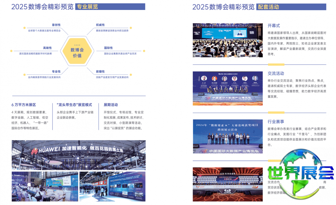 数字经济与数据要素展览是数博会的关键环节之一,将设置6个专题展馆,布展面积约6万平方米。紧扣国家数据工作部署重点,涵盖国际综合、前沿科技、数据资源、“数据要素”、数据安全、基础设施六大专业领域,集中呈现大数据行业的新技术、新产品、新方案及实际应用场景。同时,展会期间还将安排企业自主发布等活动,为企业提供品牌推广与展示窗口。