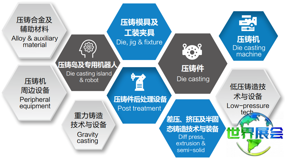 压铸、有色金属及特种铸造:压铸成型件、压铸机械设备、压铸机辅助设备、压铸合金及添加剂、压铸单元及专用机器人、压铸件后续加工设备、压铸模具及工装夹具、重力铸造工艺与设备、低压铸造工艺与设备、差压、挤压及半固态铸造技术与装备