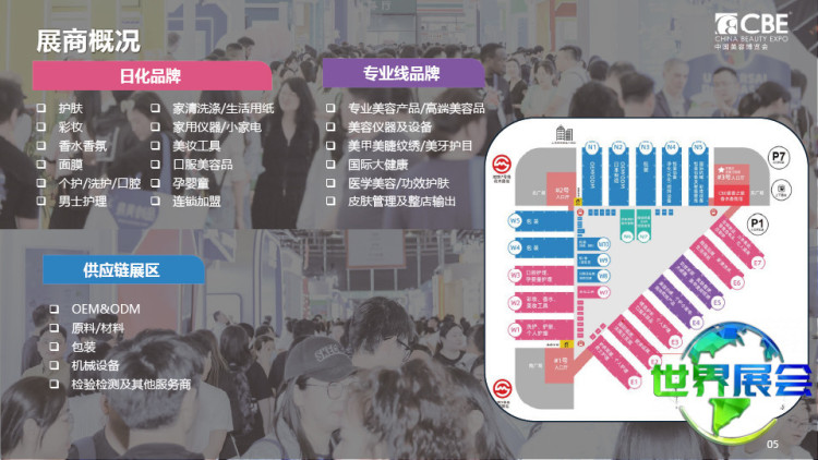 化妆品品牌展区:护肤品、彩妆、香水香氛、面膜、个人护理用品、男士护理、洗护发产品、家用美容仪、家庭清洁用品、口服美容品、美妆工具、连锁加盟
