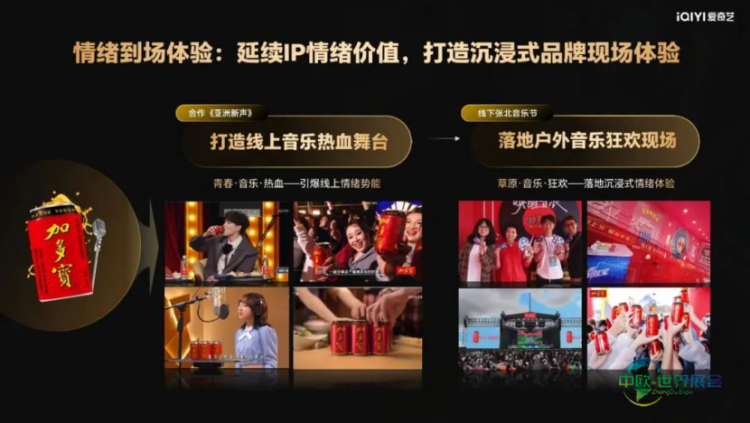 情绪营销不仅停留在荧幕内,更要延展至线下,打造沉浸式的品牌现场,直接拉动终端销售。加多宝与爱奇艺综艺《亚洲新声》的合作中,线上它是选手熬夜排练的续命神器、吃辣时的好搭子。在线下,爱奇艺则为加多宝策划了张北音乐节冠名,并在十个重点城市打造移动邮轮。观众看完节目后,可以跟着加多宝去草原听现场,在线下真实重温节目氛围,还能通过联名产品配合小程序上传照片,生成专属歌曲。IP从线上走到线下,不仅走进了用户心里,更切实转化为终端货架上的销量。