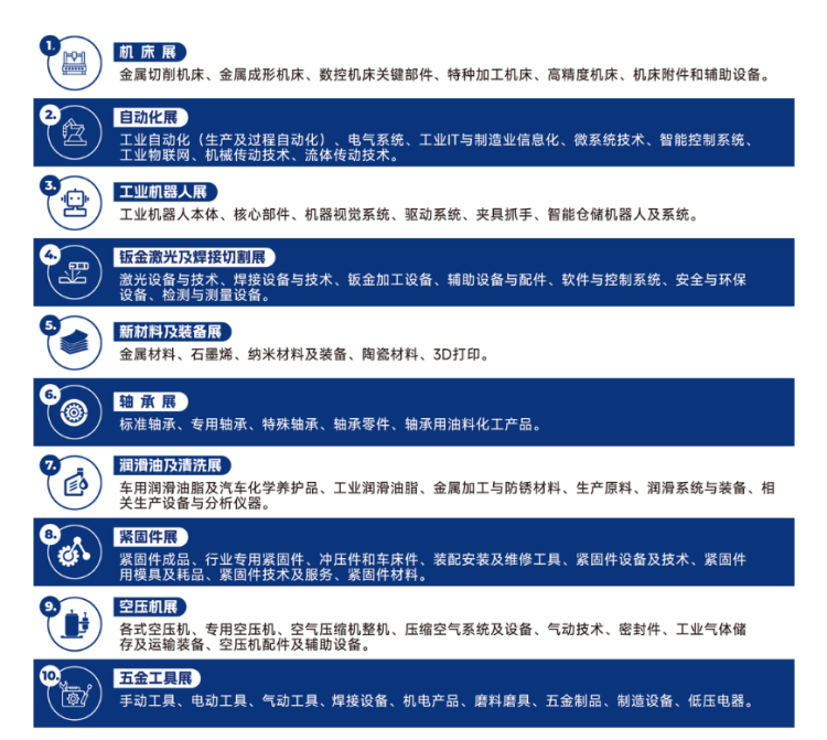 覆盖机床、机器人、自动化设备、钣金激光、纳米材料等众多领域,展示工业金属切削机床、冲床、冲压锻压设备、切削刀具、磨具、机床辅助工具、激光集成加工设备及元器件、动力传动设备、机器人本体、机器人核心部件、机器人配件、纳米材料、纳米设备、纳米产品等前沿技术和创新产品