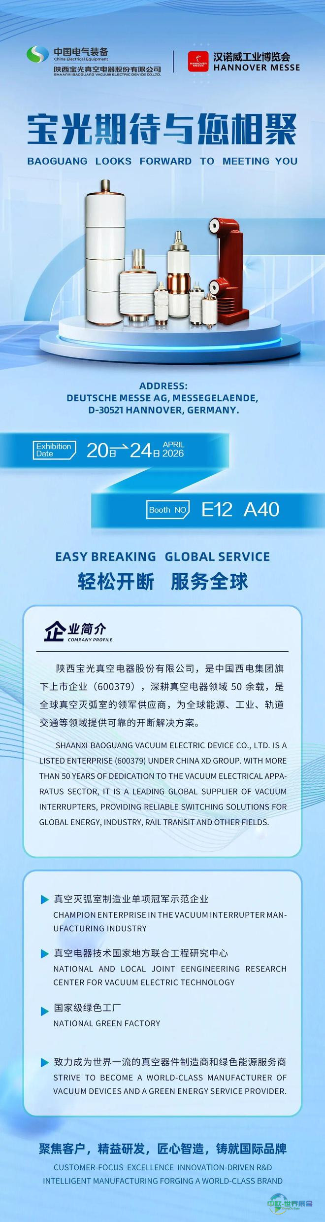 陕西宝光真空电器股份有限公司将携带其最新的研发成果,携手中国西电集团下属企业的产品联合亮相。展会期间,将实地演示真空灭弧室、真空断路器、开关柜、环保型环网柜、操动机构以及高压套管等一系列产品。我们真诚地邀请您光临我们的展台,共同探讨合作新前景!