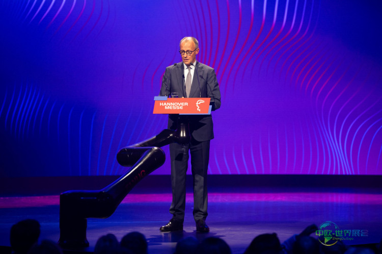 4月19日,德国总理默茨在汉诺威工业博览会开幕式上发表讲话。
