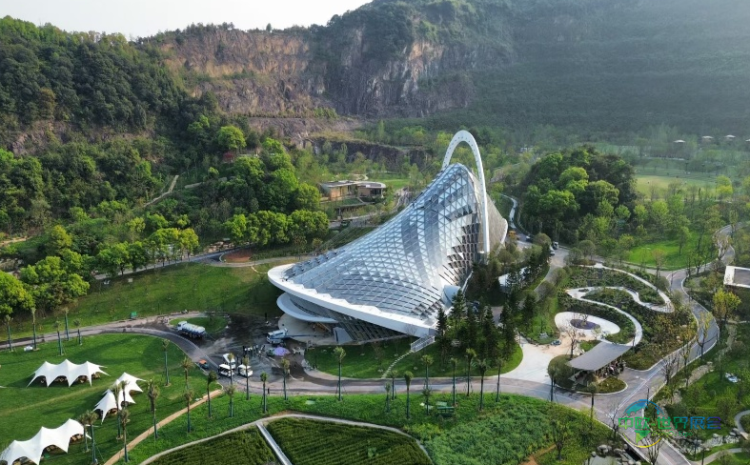 作为本届园博会的参建方之一,中建八局负责承建园博园南园的核心地标建筑——葳蕤馆。该馆设计灵感来源于抽象的贝壳与花瓣形态,建筑语言采用柔和浪漫的曲线,与温室花园的生活主题完美契合。在结构与形体上,创新性地运用了网壳加拉索形式,形成独特的拱形元素和轻盈向上的轮廓,赋予建筑外观和内部空间强烈的未来感与科技韵味。外立面材料则通过高透超白玻璃与浅色金属铝板的巧妙搭配,呈现出简洁大气、现代轻盈的视觉效果,静立于山间田园之上。