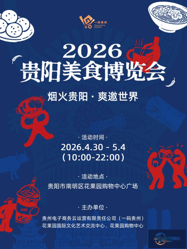 五一假期,贵阳等你来。4月30日至5月4日,由贵州电子商务云运营有限责任公司(一码贵阳)、花果园国际文化艺术交流中心、花果园购物中心共同主办的2026贵阳美食博览会,将在贵阳花果园购物中心广场盛大开幕。本届展会以“烟火贵阳・爽邀世界”为口号,瞄准年轻消费新动向,整合九大主题展区及众多优质品牌商家,推出多项主题活动和惠民福利,为消费者带来集美食体验、产业展示、文化交流、消费优惠于一体的城市美食嘉年华。