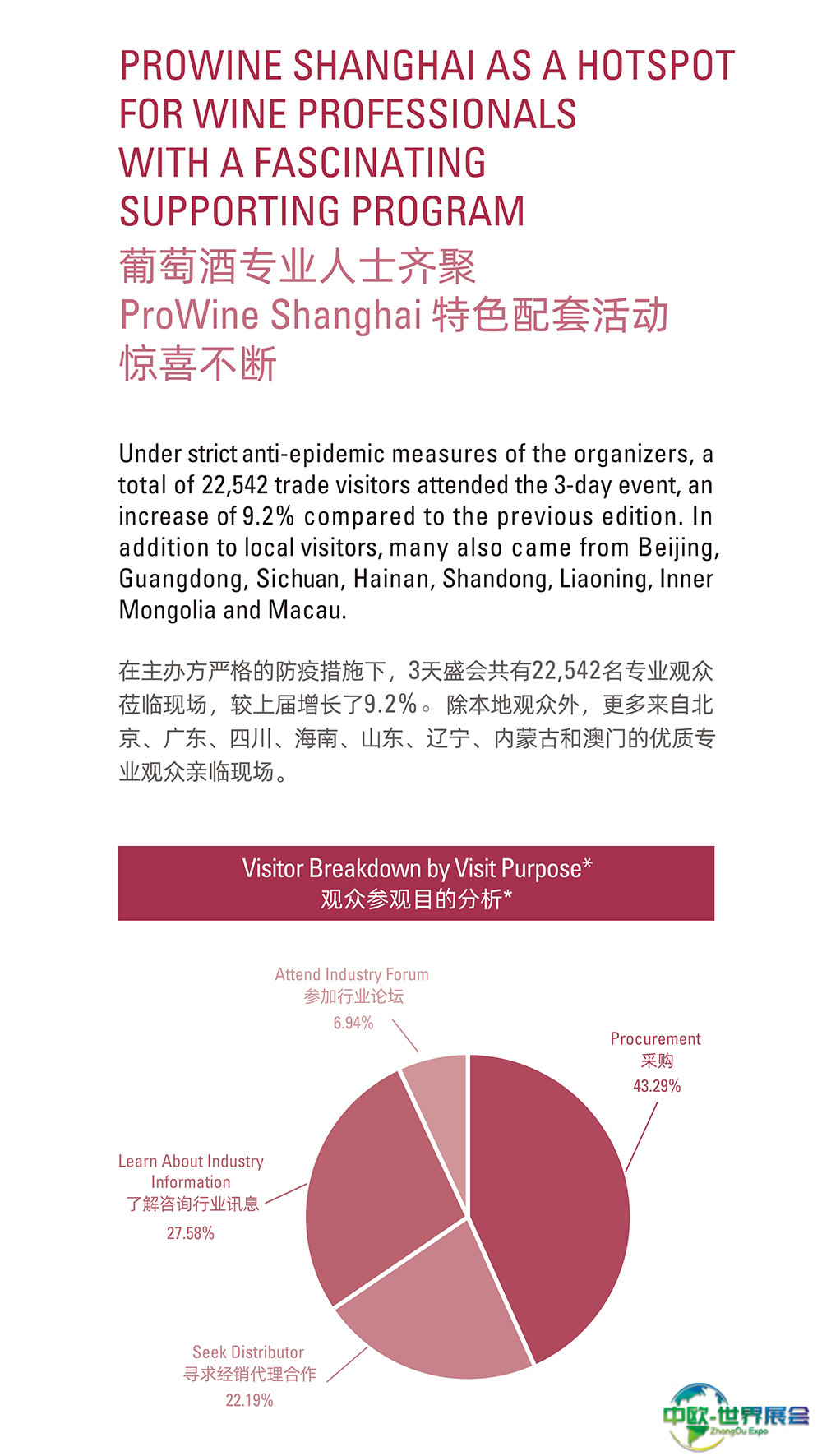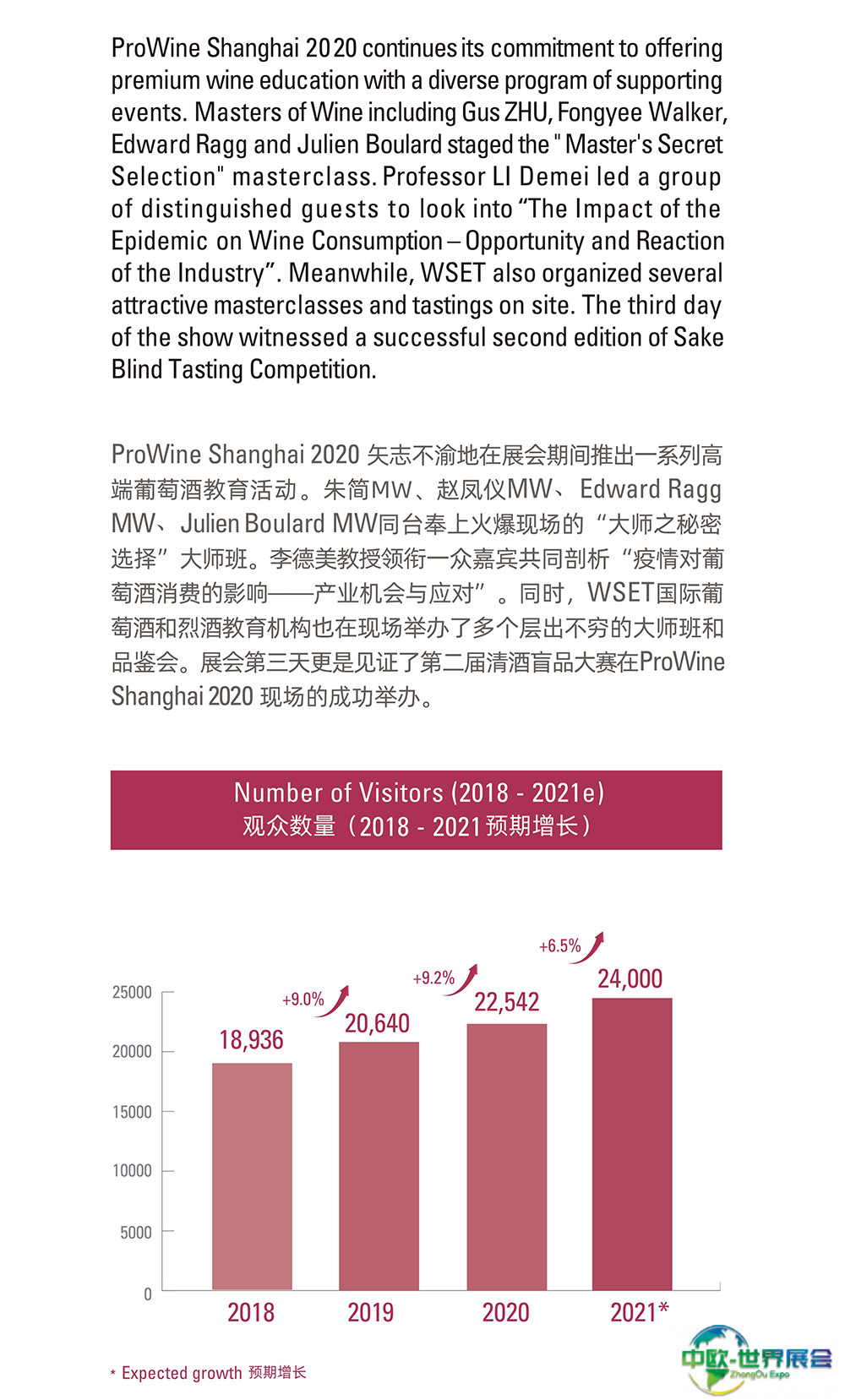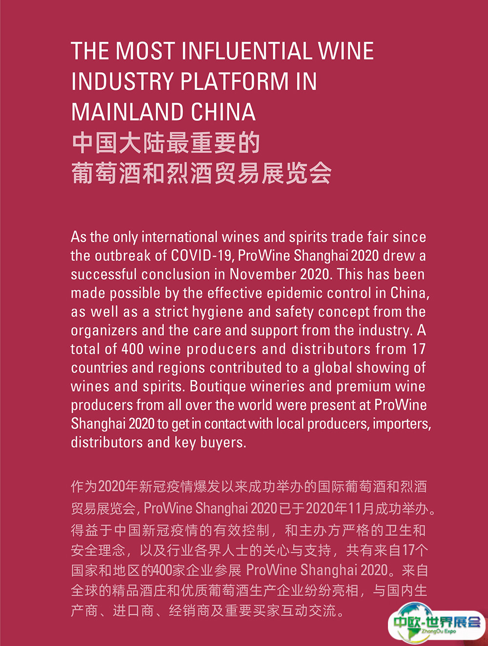 上海国际葡萄酒、红酒、烈酒贸易展览会(ProWine)是中国领先的葡萄酒与烈酒贸易展览会。每届展会收到了与会人士的积极反馈,并将新标准定为中国大陆最具国际性的葡萄酒和烈酒交易会。唯葡萄酒中国的游客和国际参展商人数继续增长,今年继续创造新的纪录。ProWill中国公司在各大城市的持续推广和宣传活动使ProWine Shanghai平台的存在和成就不断增加。