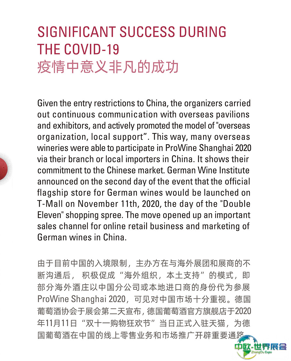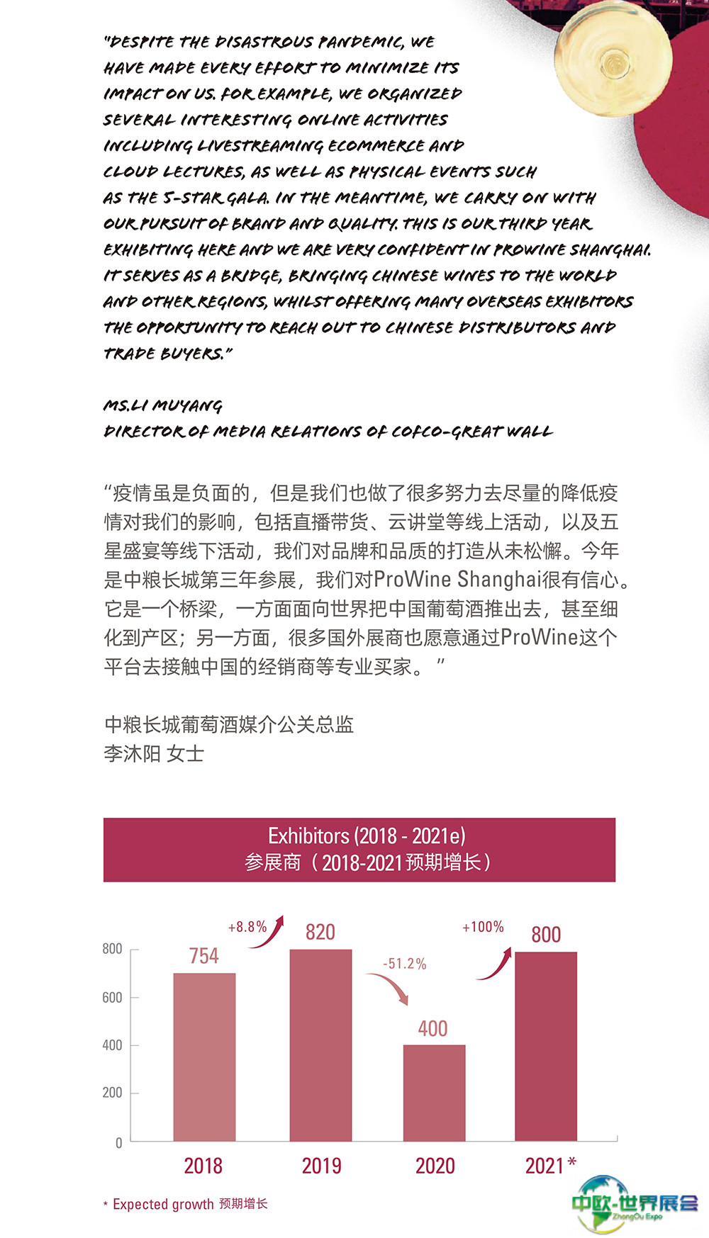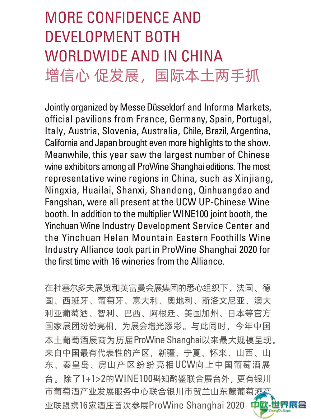 上海国际葡萄酒、红酒、烈酒贸易展览会(ProWine)是中国领先的葡萄酒与烈酒贸易展览会。每届展会收到了与会人士的积极反馈,并将新标准定为中国大陆最具国际性的葡萄酒和烈酒交易会。唯葡萄酒中国的游客和国际参展商人数继续增长,今年继续创造新的纪录。ProWill中国公司在各大城市的持续推广和宣传活动使ProWine Shanghai平台的存在和成就不断增加。