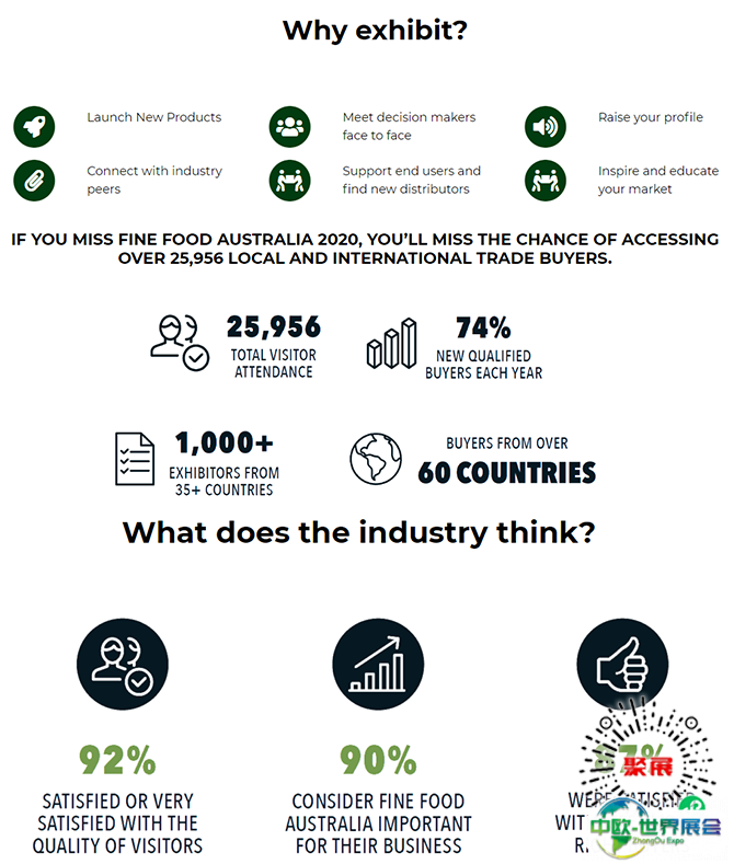 澳洲澳大利亚食品饮料及烘焙展览会(Fine Food Australia)每届都吸引着来自世界各地的食品饮料生产商和专业贸易人士。是食品行业中相互建立客户联系、订购产品的理想场所和交流盛会。