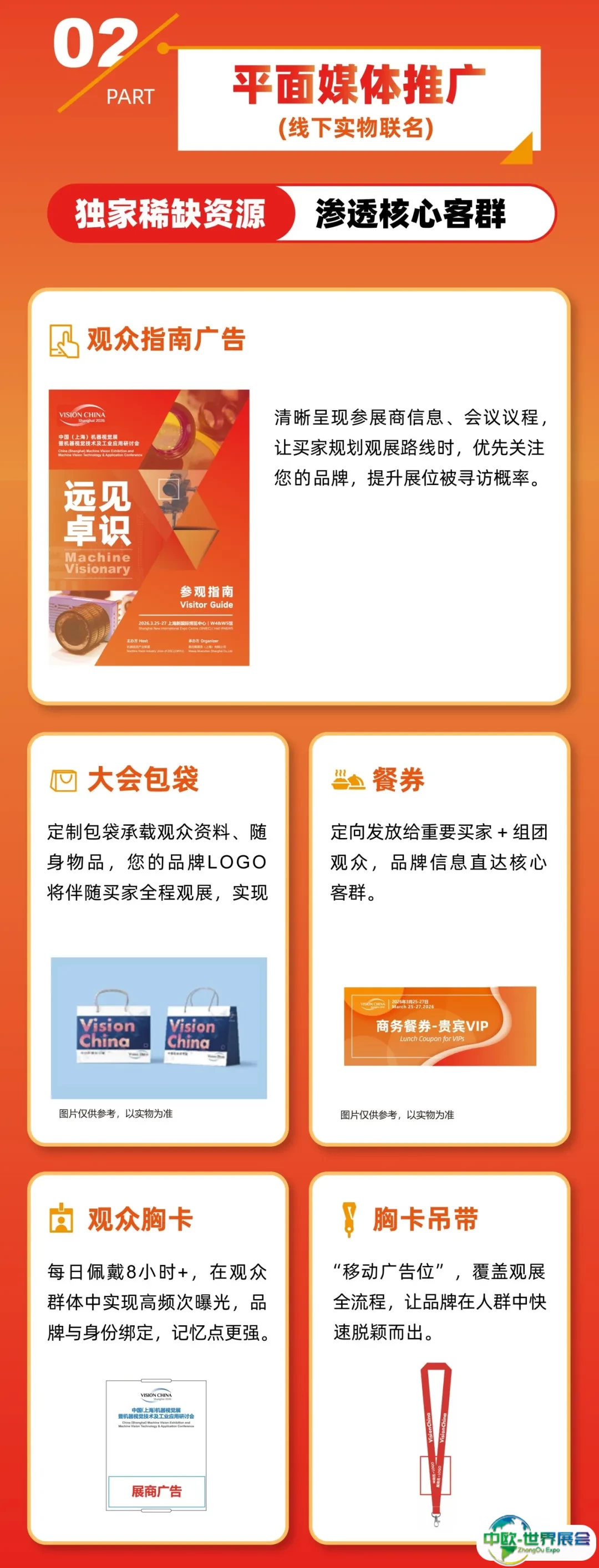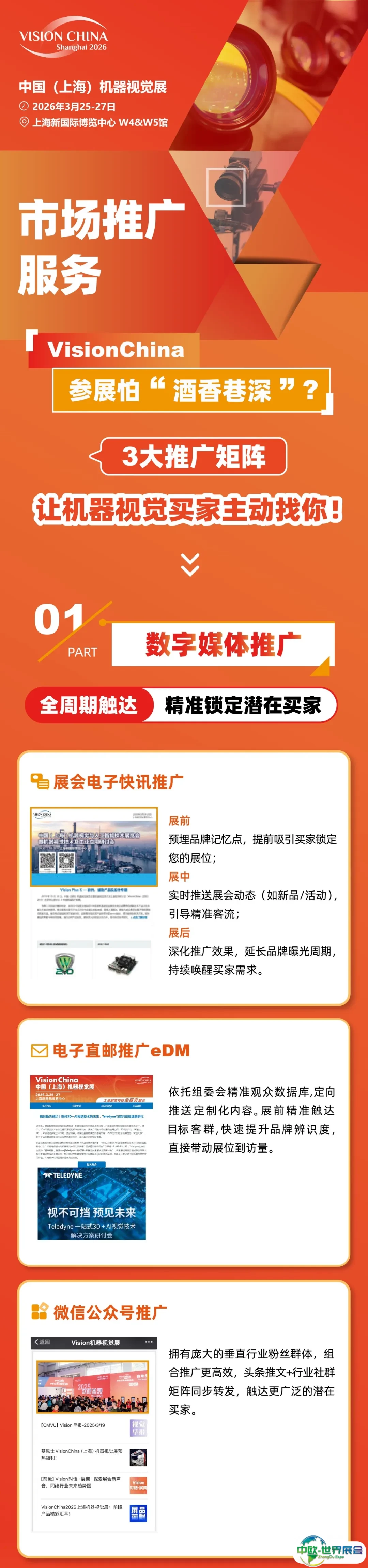 VisionChina2026(上海)机器视觉展作为机器视觉领域的行业盛会,不仅为展商提供了展示创新技术与产品的绝佳平台,更通过多元化的市场推广服务助力企业提升品牌影响力、精准触达目标客户群体。我们诚挚鼓励各位展商积极选购展会定制的市场推广方案,通过全方位资源联动实现参展效益最大化,共同打造一场高效、专业的行业交流盛宴!