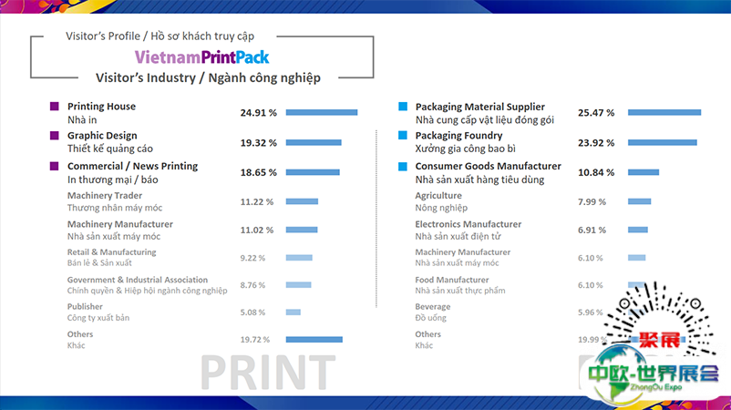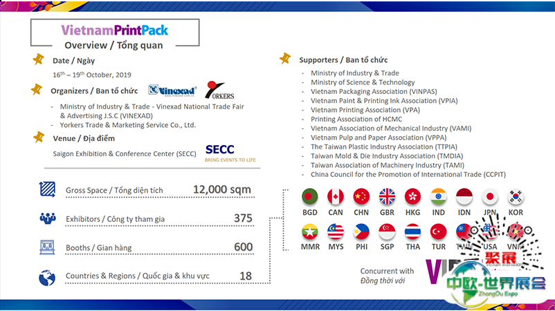 越南胡志明包装及印刷展览会(Vietnam Print Pack)展出行业内最新款的设备、原料及供应线,并为包装行业顶尖企业和中小型或刚起步的公司间的商业交流起到了桥梁作用。为采购商选购设备、了解国内外包装机械及相关技术发展趋势及现状的首选展会。