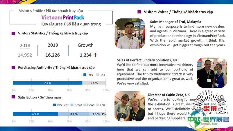 越南胡志明包装及印刷展览会(Vietnam Print Pack)上届展会总面积15000平方米,参展企业366家均来自中国、日本、韩国、意大利、印度、印尼、马来西亚、柬埔寨、迪拜等,参展人数达14762人。