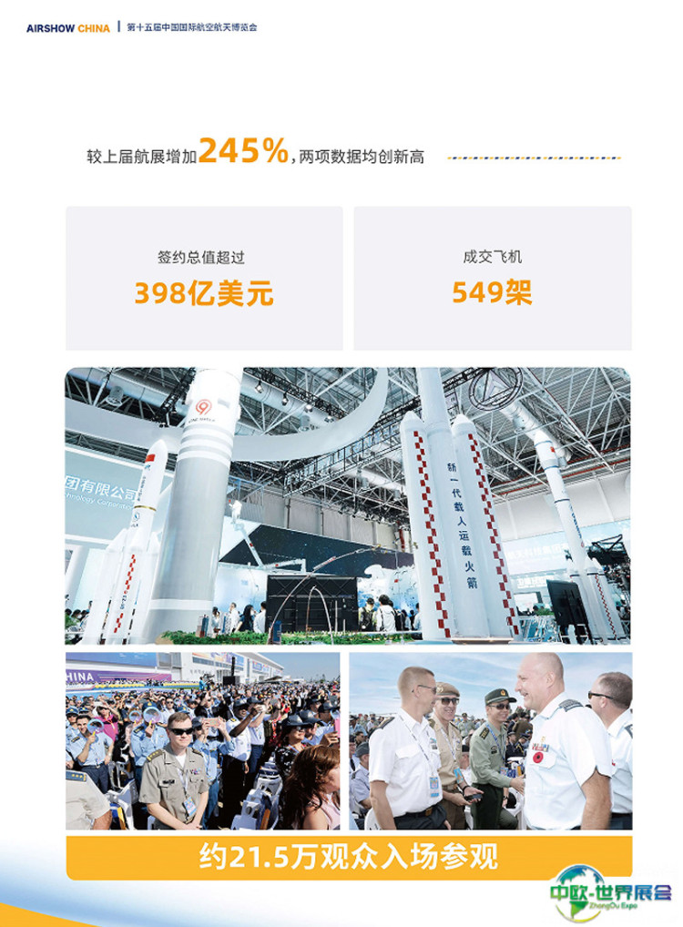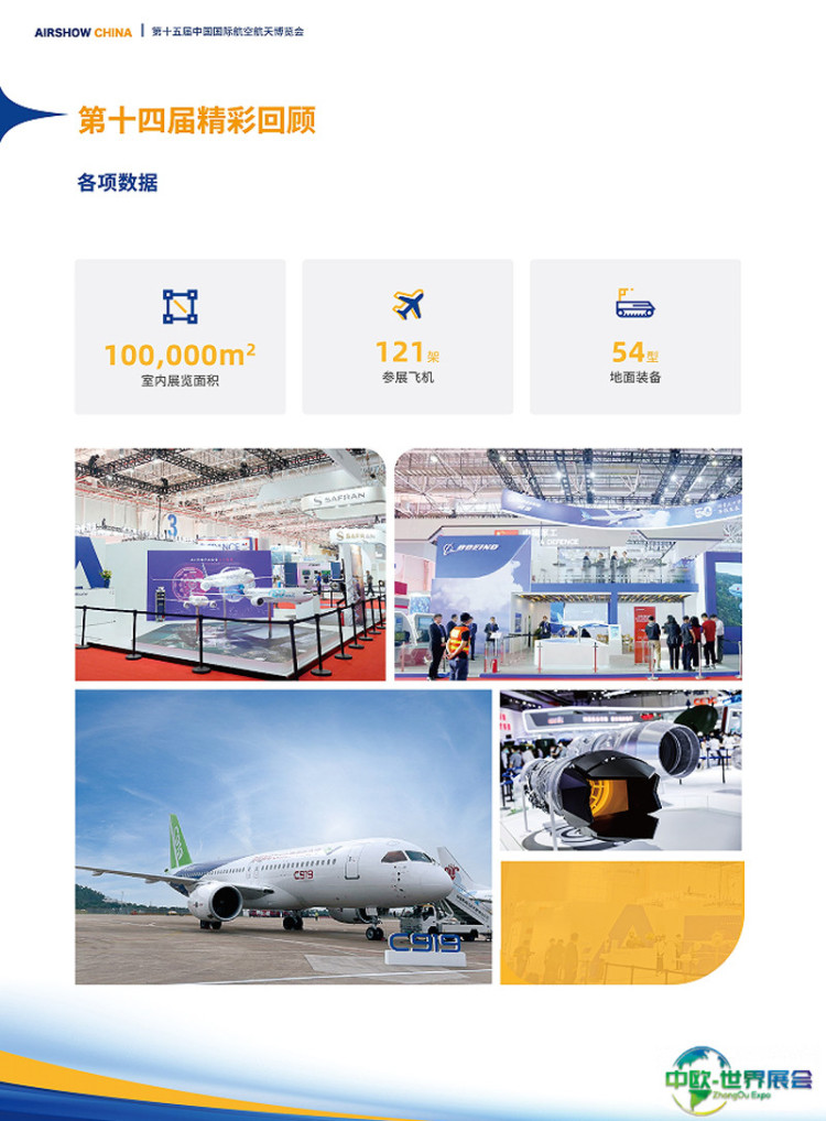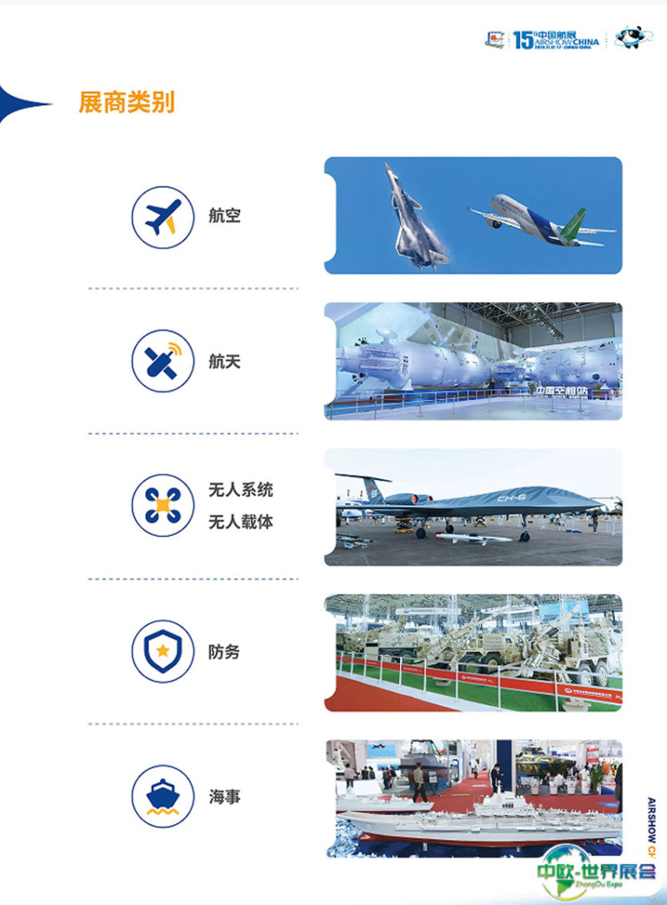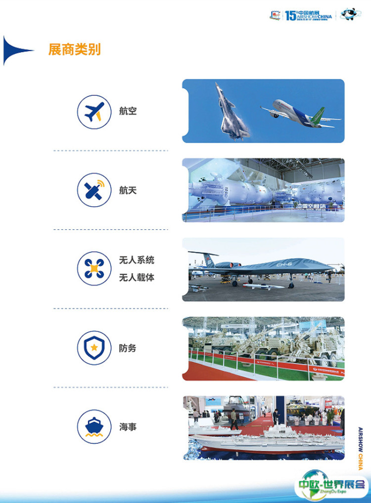 中国国际航空航天博览会-珠海航展(AIR SHOW CHINA)将启用13个展馆,室内展览面积达12万平米,较上届增长了20%;室外展览面积约23万平米;首次开辟“无人系统演示区”,含“无人船演示区”和“无人机演示区”;参展国家和地区47个,国内外参展商近800家。其中俄罗斯、法国、美国、沙特将以展团形式参展,波音、空客、霍尼韦尔、巴航工业、赛峰、泰雷兹等世界知名航空企业悉数亮相。
