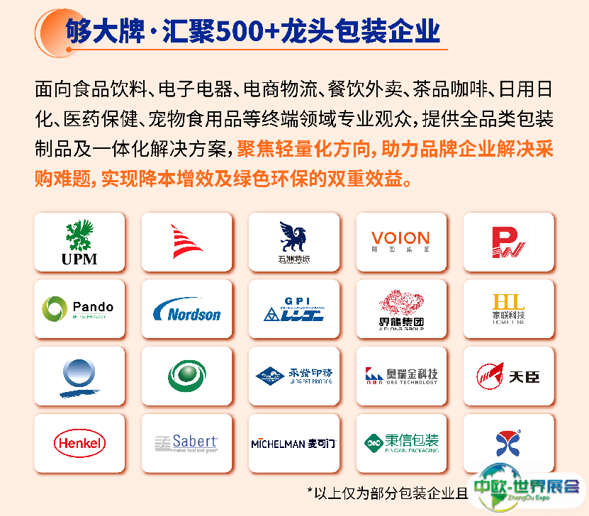 截至目前,联合包装、顺安塑业 、普拉斯 、韶能绿洲 、天臣、中亚瑞程、大满、树合、辉凯鼎瑞、永顺和、宣航、益新、家联 、馨星、凯达、金石、博升、麦可门、瀚邦、国为、宝佳利、十鼎、微构、道远、海方、精丽、恒佳、鼎茂、沐睿、创艺、盛隆、新发现、浩友夫、新智特、航天华阳、必硕、华工环源、南亚、配天、汉通、环强、新磊、天邦、天牛、富茂、众望、邦杰 、宏硕、晓辉、沃尔特、青岛榕信、五洲特种纸业、海南天鉴防伪、厦门长塑、银金达新材料、群乐包装、依森纸制品、港萱环保、格睿包装、辛诚生态、盈泰包装、中亚瑞程、双昌盛制罐、贝斯特机械、世欣环保材料、致远纸塑设备、久连生物、昆保达纸塑包装、京澳(排序不分先后)等多家行业内领先的包装容器、材料及设计服务供应商已确认参展,盛况空前。