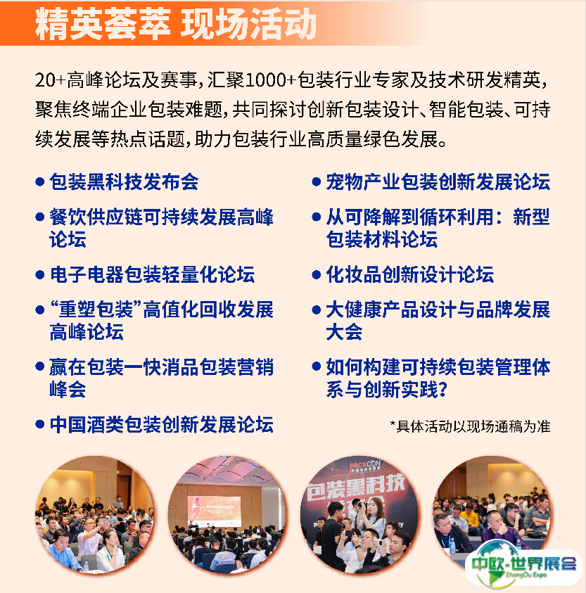 中国包装容器展(PACKCON)重磅打造的全品类包装容器的商贸采购与交流平台。现场集展览、会议、赛事、直播课程、商贸配对等专业服务于一体,汇聚来自电子电器、电商物流、食品、饮料、餐饮外卖、日用、日化、医药保健8大终端领域的包装采购决策者,是包装容器供应商了解市场资讯、获取优质订单和建立商务联系的绝佳平台。